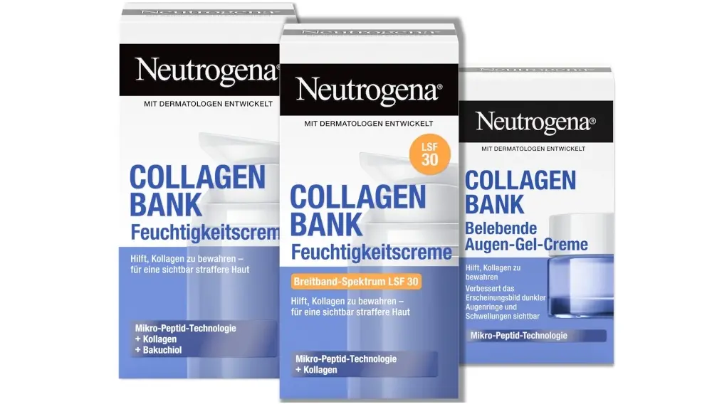 Entdecke die Produkte von Neutrogena® Collagen Bank. Mit Dermatologen entwickelt, helfen die Produkte deiner Haut, Kollagen zu bewahren und verbessern das Erscheinungsbild der Haut. Die Neutrogena® Collagen Bank Feuchtigkeitscreme unterstützt die Hautstruktur, verbessert die Elastizität und sorgt für ein sichtbar strafferes Hautbild. Auch erhältlich als Gesichtspflege mit Sonnenschutzfaktor mit der Neutrogena® Collagen Bank Feuchtigkeitscreme LSF 30. Die Produkte eignen sich hervorragend für die tägliche Anwendung und alle Hauttypen – auch für empfindliche Haut.