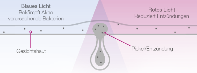 P. acnes, also jene Bakterien, die ursächlich für Akne verantwortlich sind, haben eine verborgene Schwäche: Sie produzieren Moleküle (Porphyrine), die empfindlich auf Licht reagieren. Wenn diese Porphyrine das blaue Licht absorbieren, produzieren sie freie Radikale. Die freien Radikale schädigen die Zellmembran der Akne verursachenden Bakterien, wodurch diese bekämpft werden.
